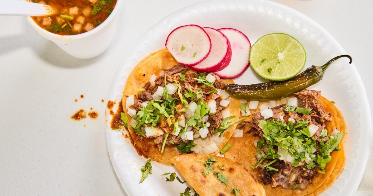Robert Barjas Jr. si sveglia ogni giorno alle 2 del mattino per iniziare a preparare i biriya hornedas – “al forno”, dice. “Prima lo facevamo in terra, ora usiamo i forni convenzionali per ottenere quel gusto croccante.” Non si riduce mai, aggiunge Barjas. Suo padre ha avviato l’attività diversi anni fa, servendo Birria de Chivo poiché la famiglia la produce da tre generazioni a Tecalitlan, Jalisco. Biraria Barajas ha aperto prima come puesto su Compton Boulevard e poi ha lanciato un camion dall’altra parte della strada, parcheggiato davanti all’Eddie’s Liquor tutti i giorni tranne il lunedì, a partire dalle 6:30.