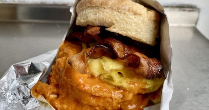 I suoi panini con biscotti sono preparati utilizzando la ricetta dei biscotti al latticello di sua nonna del sud. Sono lunghi e friabili, con una mollica tenera. Per qualche dollaro in più, puoi aggiungere pancetta e formaggio pimento. Haltiwanger spalma il burro sia all’esterno che all’interno dei biscotti prima di aggiungere una pallina di formaggio pimento. Uova calde, pancetta e biscotti sciolgono il formaggio in un’arancia affumicata e speziata che trasuda dallo strato inferiore. Non riesco a immaginare di ordinarlo in altro modo.