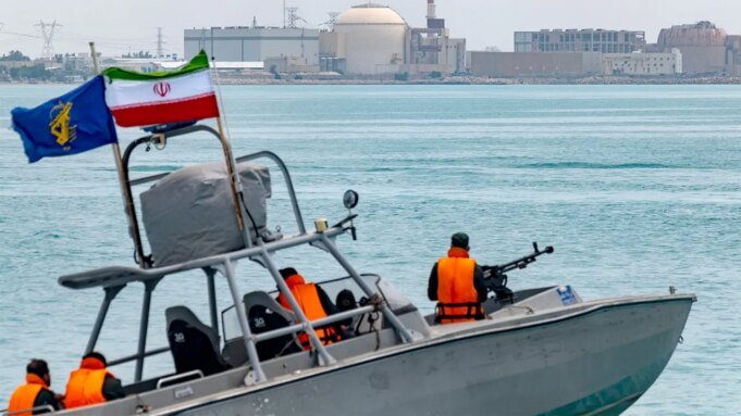 Membri della Marina del Corpo delle Guardie rivoluzionarie islamiche si trovano su una nave da guerra durante una parata navale della Guardia rivoluzionaria iraniana che celebra la Giornata nazionale del Golfo Persico vicino alla centrale nucleare di Bushehr a Bushehr, in Iran, il 29 aprile 2024. (Mortaza Nikoubazel/Nour Foto tramite Getty Images)