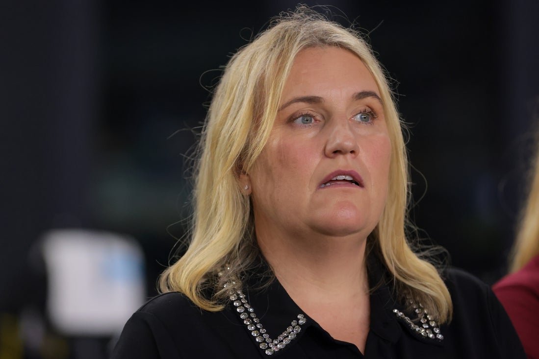1 dicembre 2025; Fort Lauderdale, Florida, Stati Uniti; Emma Hayes, allenatrice degli Stati Uniti, ascolta l’inno nazionale prima della partita contro l’Italia al Chase Stadium. Credito obbligatorio: Immagini di Sam Navarro-Imagn
