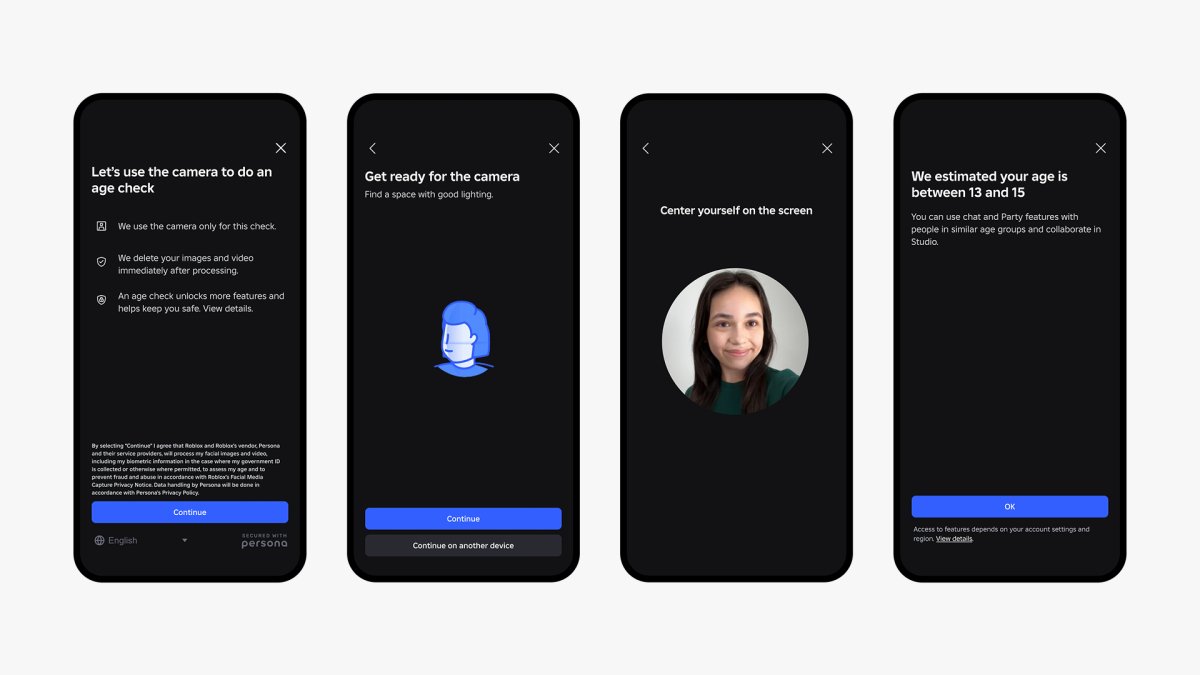 A novembre è stata annunciata la funzionalità di stima dell’età a livello di sito di Roblox, che utilizza la tecnologia di stima dell’età basata sull’intelligenza artificiale fornita dal fornitore di terze parti Persona e utilizza fotocamere sul dispositivo. Il sistema classifica quindi gli utenti in una delle sei categorie: sotto 9, 9–12, 13–15, 16–17, 18–20 e 21+. La tecnologia è stata inizialmente lanciata come parte di uno strumento di chat collaudato per utenti di età compresa tra 13 e 17 anni.